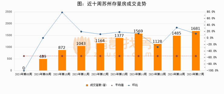 存量房方面,第16周苏州存量房成交1681套,较上周增加196套,环比上涨13.2%。从近十周成交走势来看,周均成交套数为1080套,本周高于平均水平55.6%。