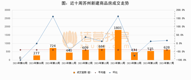 进入2024年第16周(04月15日-04月21日),苏州新建商品房成交628套,较上周增加93套,环比上涨17.4%