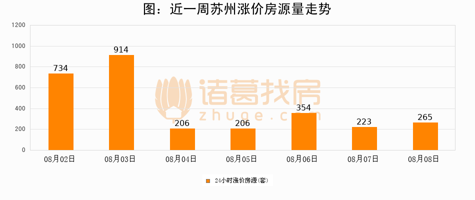 根据诸葛找房数据显示,苏州24小时涨价房源量为265套,较08月07日增加42套,环比上涨18.8%。与此同时,涨价房源占比小幅扩大,业主信心有所提升。