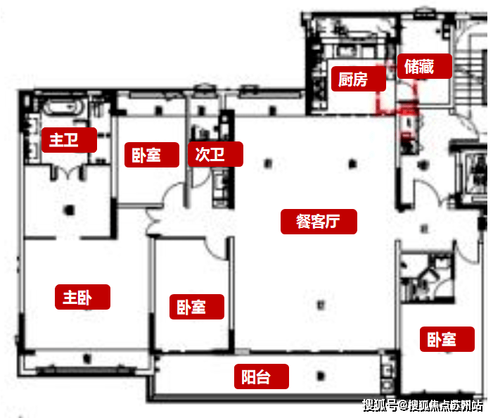 户型是4房2厅3卫,四开间朝南,南向面宽达约18.6m,南向双卧室套房设计,主卫是双台盆+浴缸设计,整体空间尺度感较强。