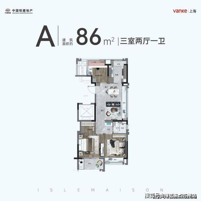 建筑面积约86㎡的3房2厅产品,是市场上非常少见的边套宽厅带大面积飘窗户型,主卧约3.5m的开间+宽面阳台+步入式衣帽间,且整个户型三面采光,几乎“0走道”,对约86㎡紧凑型3房来说,实在是太难得了。
