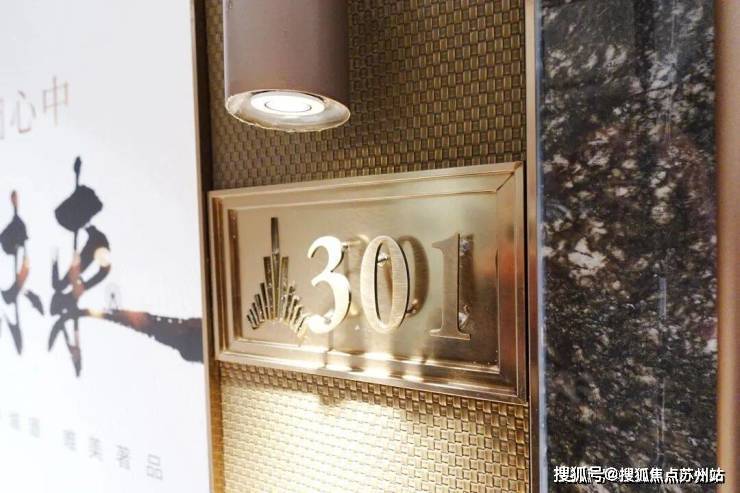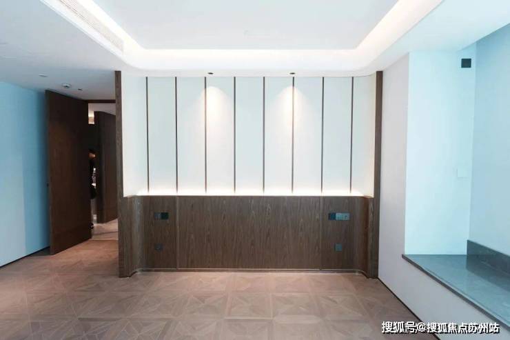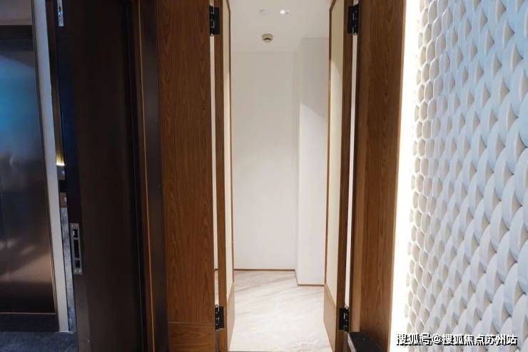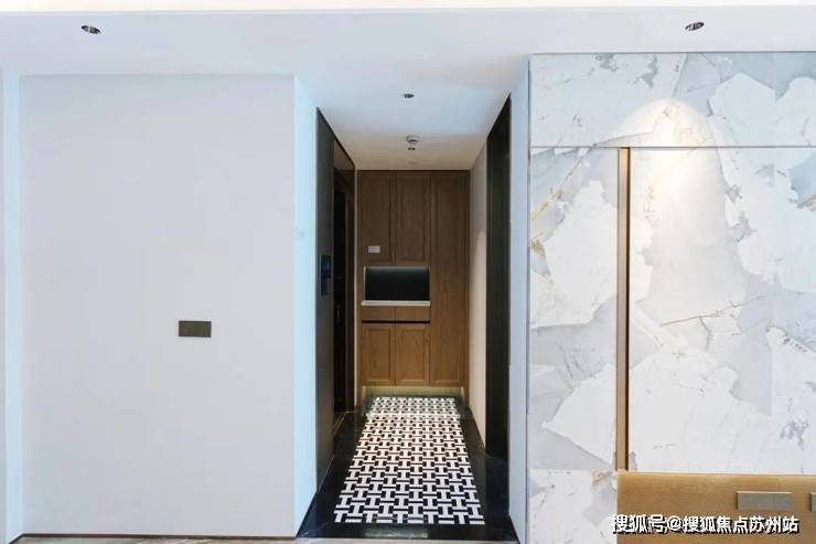 安高这次打造的交付样板间,是从电梯厅开始的。107㎡是一梯两户,电梯间区域,主要以不锈钢条作为通高区域的墙面划分,吊顶带金属弧线。入户门前,金属面板搭配编织纹,从上方打下来的暖色调灯光,映照在项目logo和室号之上,让业主从电梯里出来走到家门的时候就已经给满了仪式感。