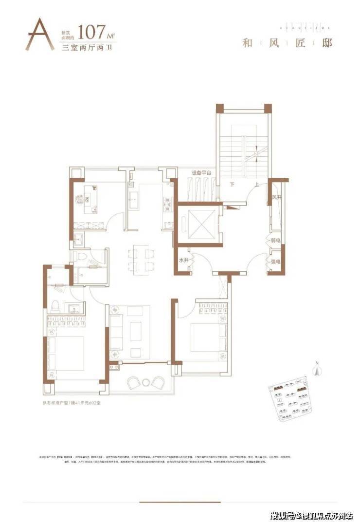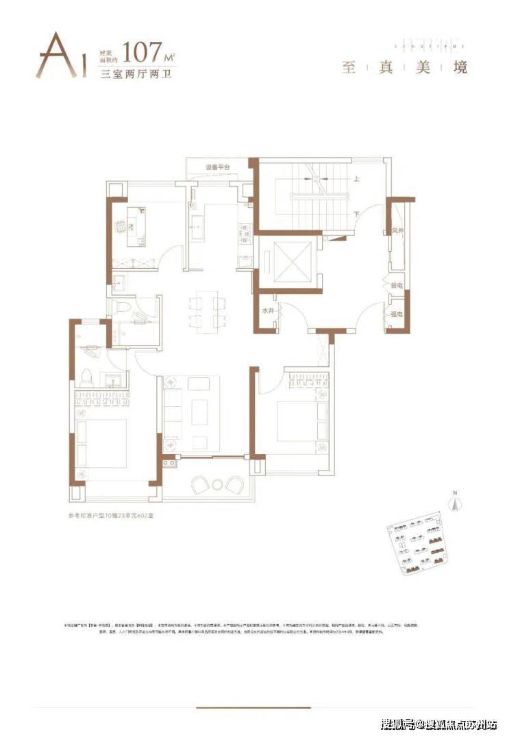 建面约107㎡3房2厅2卫户型