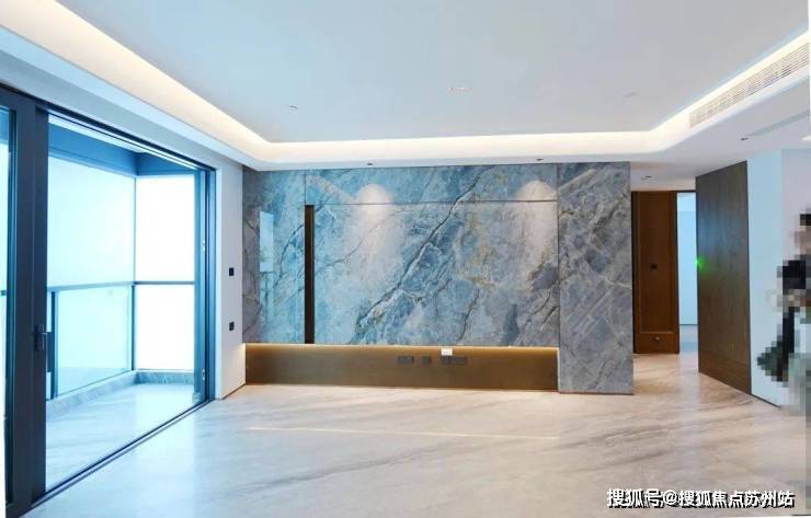 客厅则是弧形转角的悬浮吊顶,无主灯设计,电视机背景墙也是大块的岩板。特别令小编这种“强迫症”很舒适的一点是,包括电视机背景墙在内,还有客厅地砖(简一的密封砖),全都是按照地砖花纹方向统一拼起来的,这种细节都非常讲究。