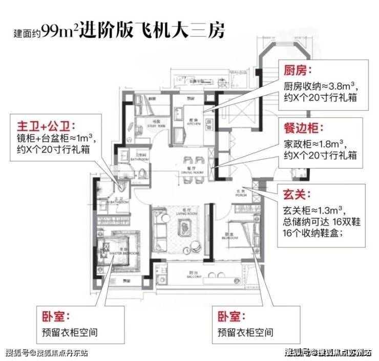 主力建面约99㎡3房产品,非常标准的南北通透飞机户型,整个室内几乎无走道,空间0浪费。