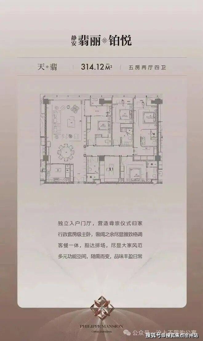 - 天翡314㎡:5房2厅4卫,独立入户门厅+行政级主卧套房,客餐一体设计彰显大宅风范。