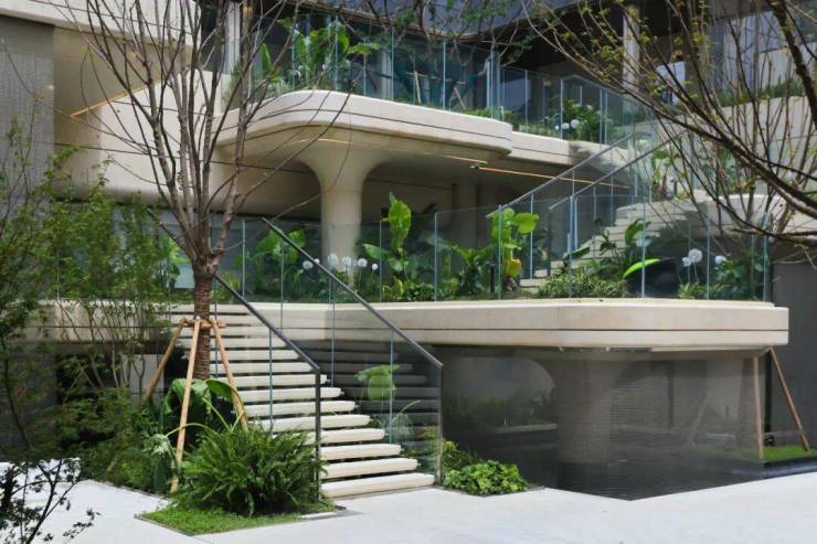 点睛之笔在于4层悬浮式阶梯,设计理念据说来自全球十二大奢华酒店之一的迪拜丽晶公寓,每一个观景露台都种植着不同的植被,一步一景,更重要的是,不同的露台对应着不同的观景视野点,将不同高度的下沉式庭院景观,通过极其优雅的方式传递给了业主。这个归家体验可以说是拉满了!