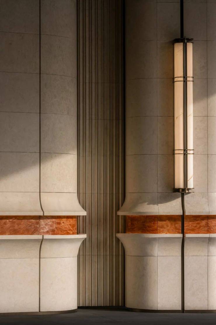 此外,招商序还藉由“吴淞灯塔”及其形制,原创落客雕塑“源流”,定制的云石玻璃、保加利亚进口的沉香米黄石材的底座,搭配以安哥拉黑大理石,营造温润的归家昭示。整个前庭形成艺术感与实用性兼具的环岛式落客区,进一步提升仪式感。