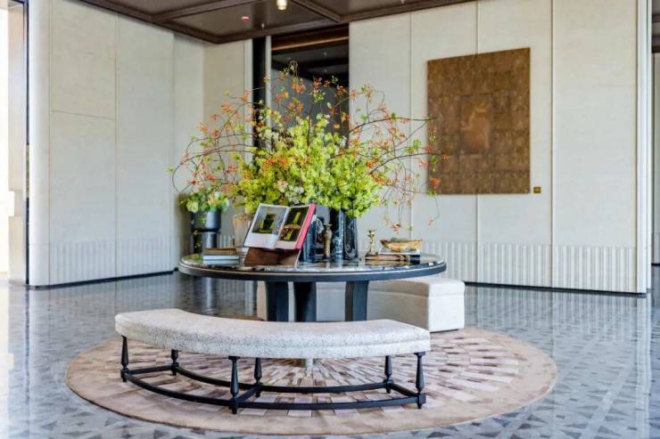 从首席制的设计操刀,六重归家的尊崇、堪称“石材博物馆”的公区立面,到四层悬浮式下沉庭院,手工定制的艺术品,甚至连社区的灯光与会所花艺都由名师执掌。