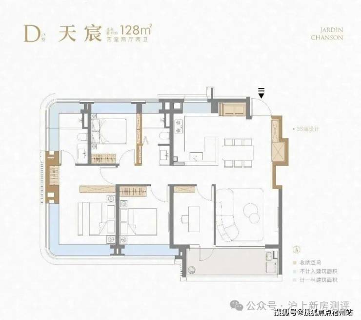 项目建面约128㎡4房户型 延续了前作3S墙的设计,保证了收纳空间的丰富性。