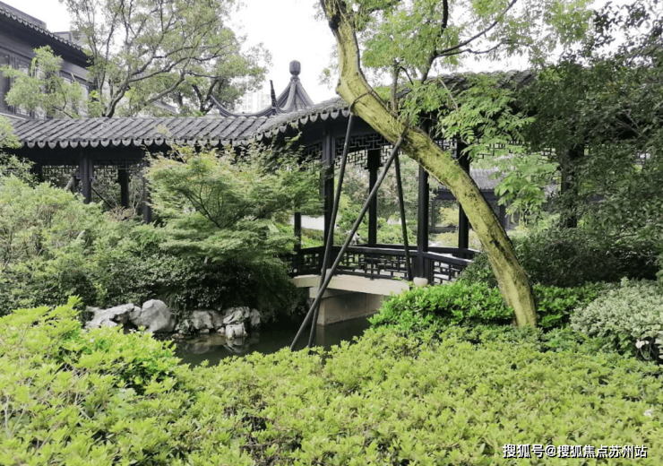 此处复刻的就是平江路的布置格局。石板长桥,清池绿植,构造了一副国风画卷。