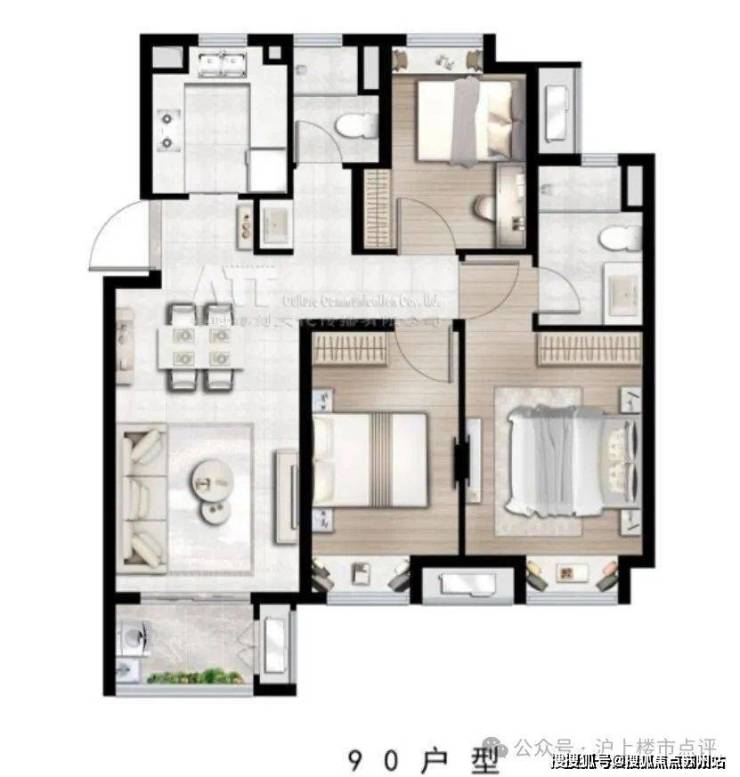 约86㎡三房两厅一卫:南北阳台,通透对流;餐客一体,生活尺度阔绰;U型厨房,动线流畅;衣帽空间,双重收纳;干湿分离卫浴,安全整洁美观;三面采光,轩朗明亮