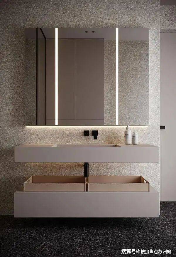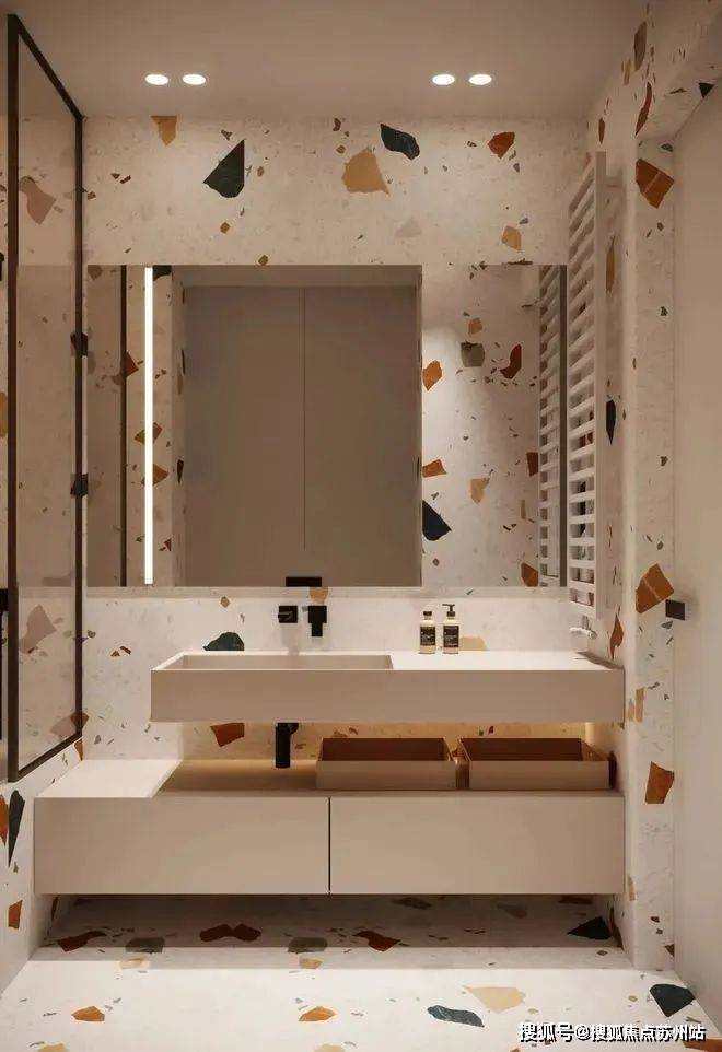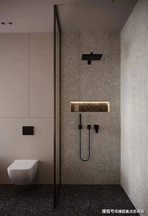 卫生间走的简约设计风格,水磨石为主体的铺设让整个空间的质感得到了提升,色调上的搭配让人也有舒适的感受。
