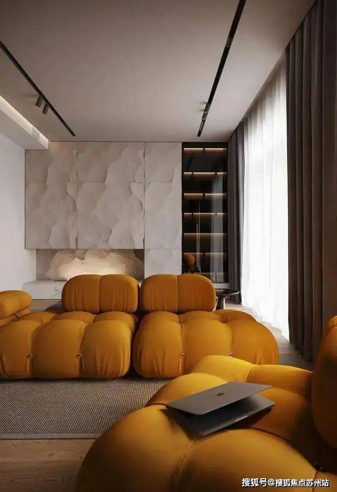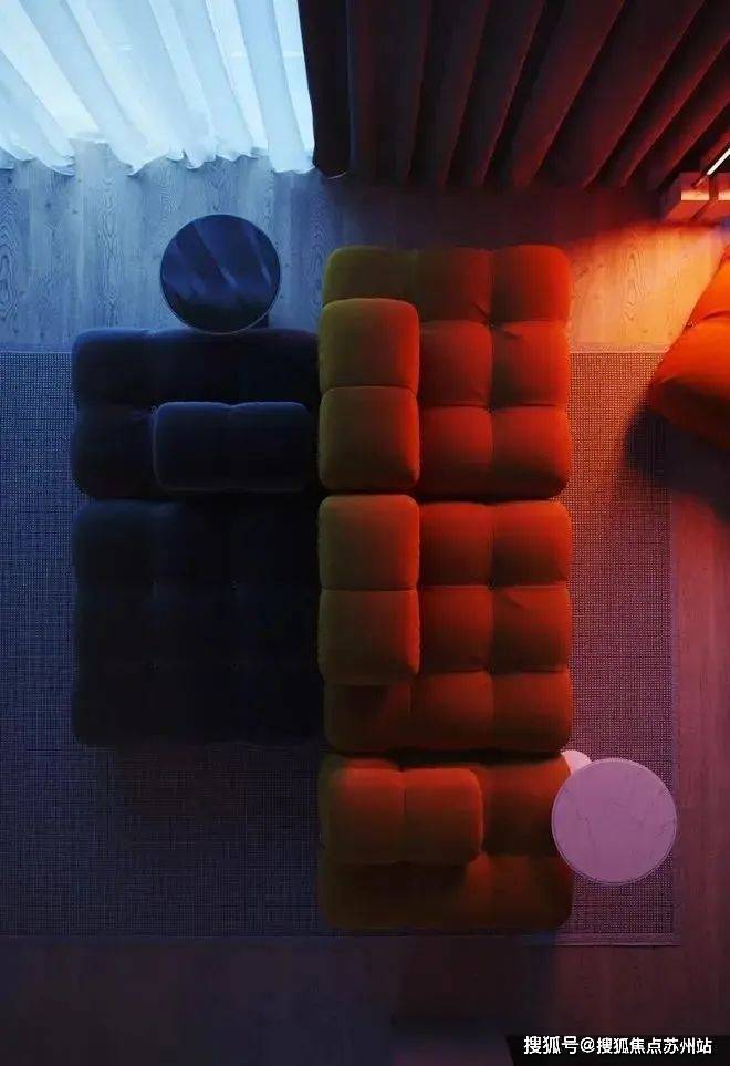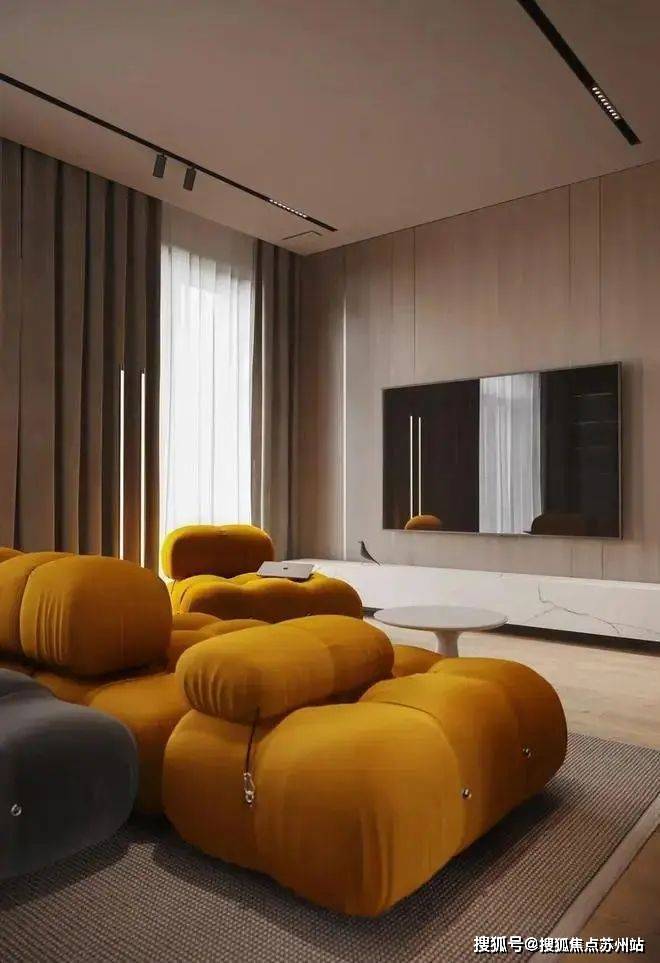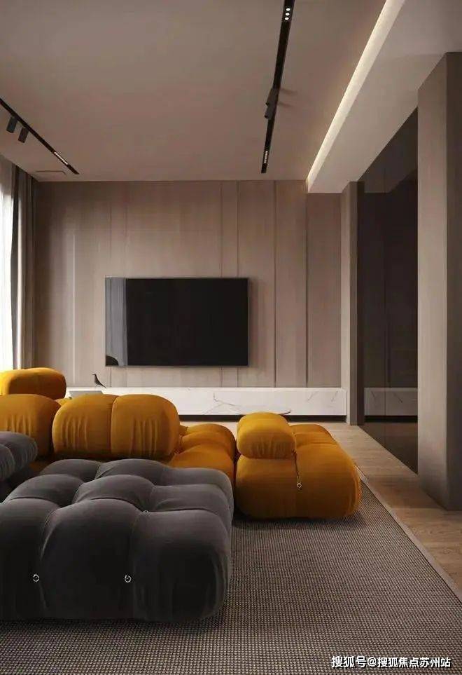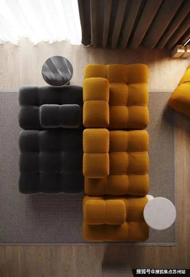 客厅的色彩以橘黄色和灰黑色的沙发为主,柔软的体积和优美的线条弧度让空间更具现代感,明暗色系的结合让氛围变得既迷人又优雅。