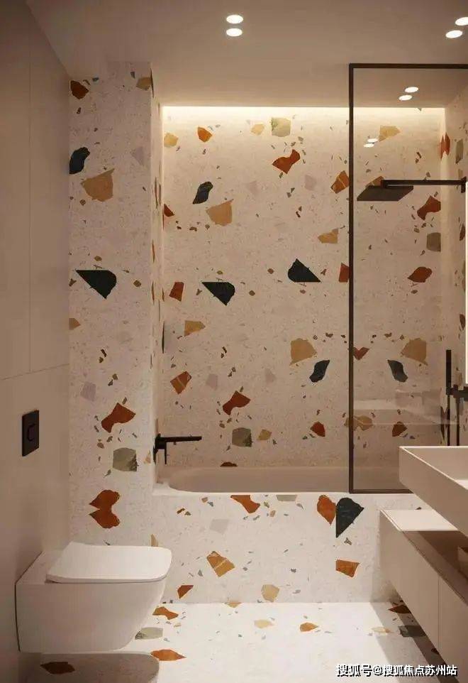 儿童浴室充满了色彩感,水磨石为基地,搭配各种颜色的色块来增加空间的趣味性。