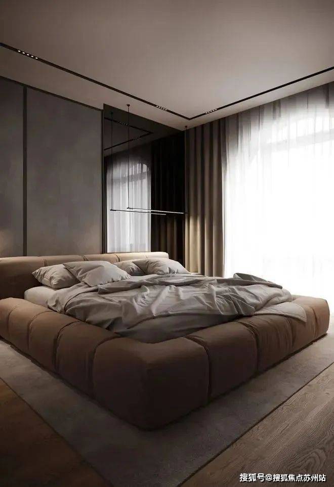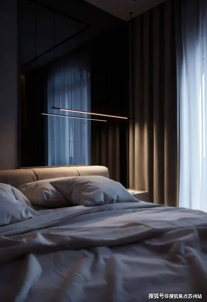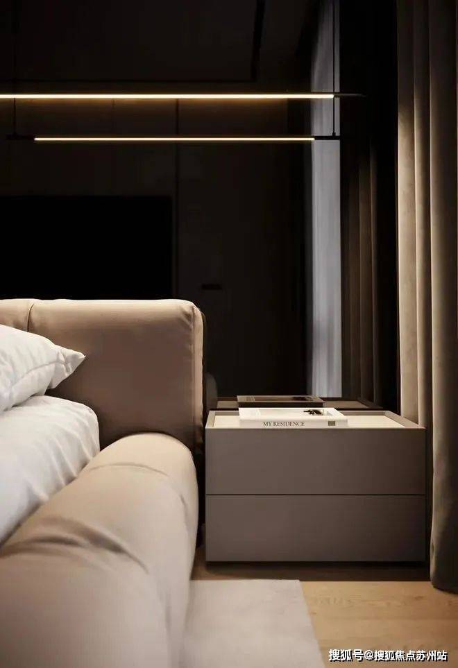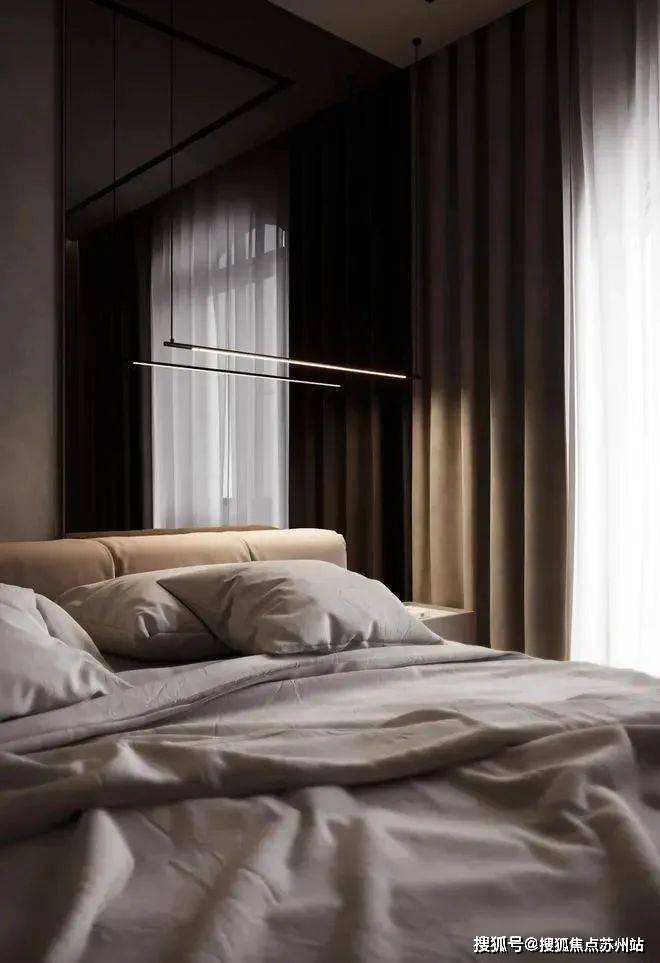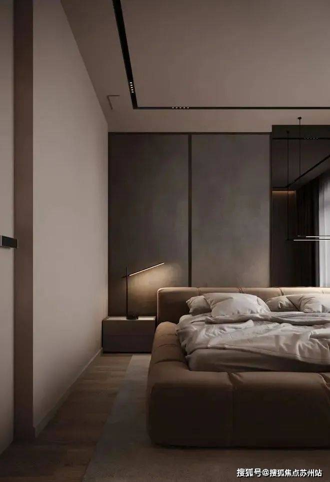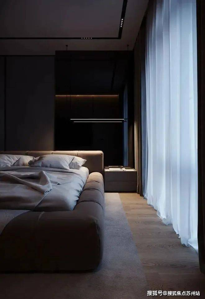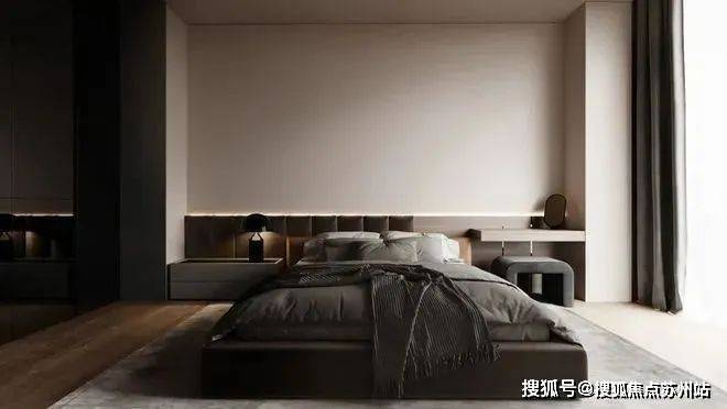 卧室整体以高级灰为主色调,利用自然光和室内人造光线的结合,营造出温馨宁静的感觉。