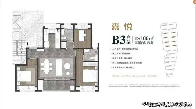 建面约100平3房2卫,则适合三代一孩家庭、可满足三代居的功能要求;
