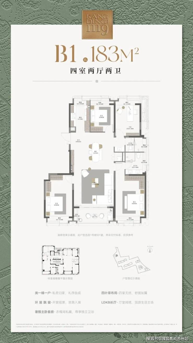 建筑面积约183㎡户型,类一梯一户设计,电梯厅私密入户,无需路过/被路过同层邻居家门,尊享悦己的静谧;