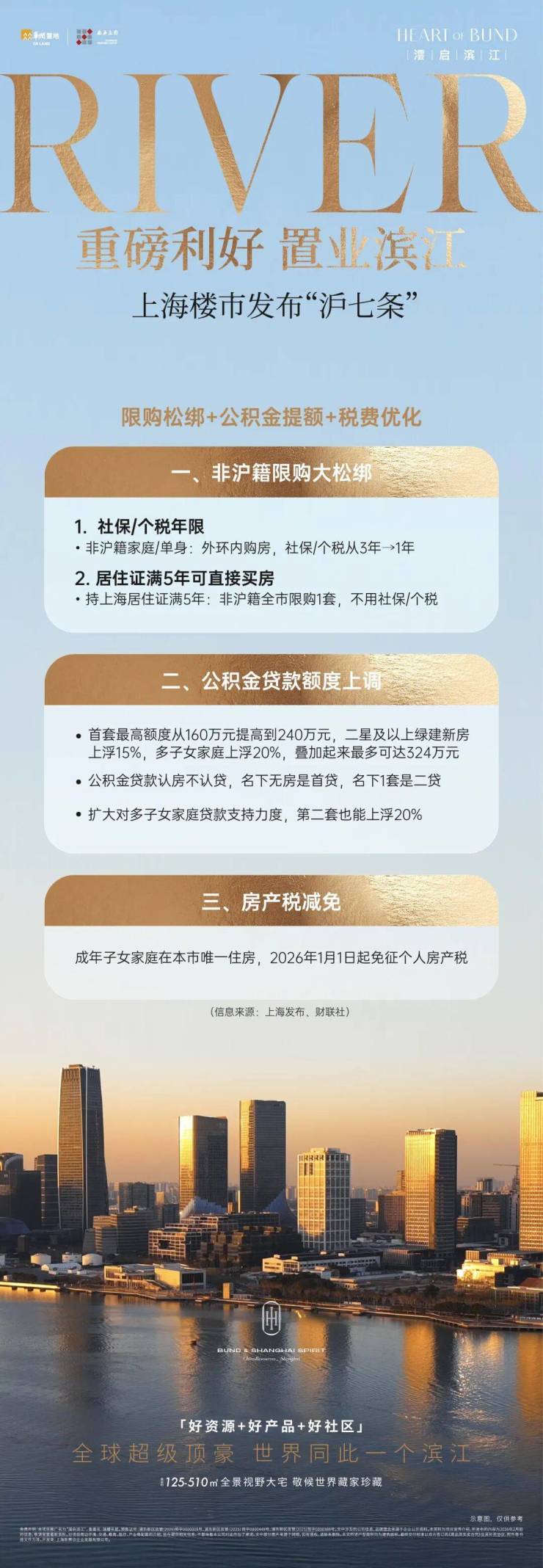 2026 年 2 月 26 日起,上海执行最新楼市 “沪七条”,核心是放宽非沪籍限购、大幅提高公积金贷款额度、优化房产税。