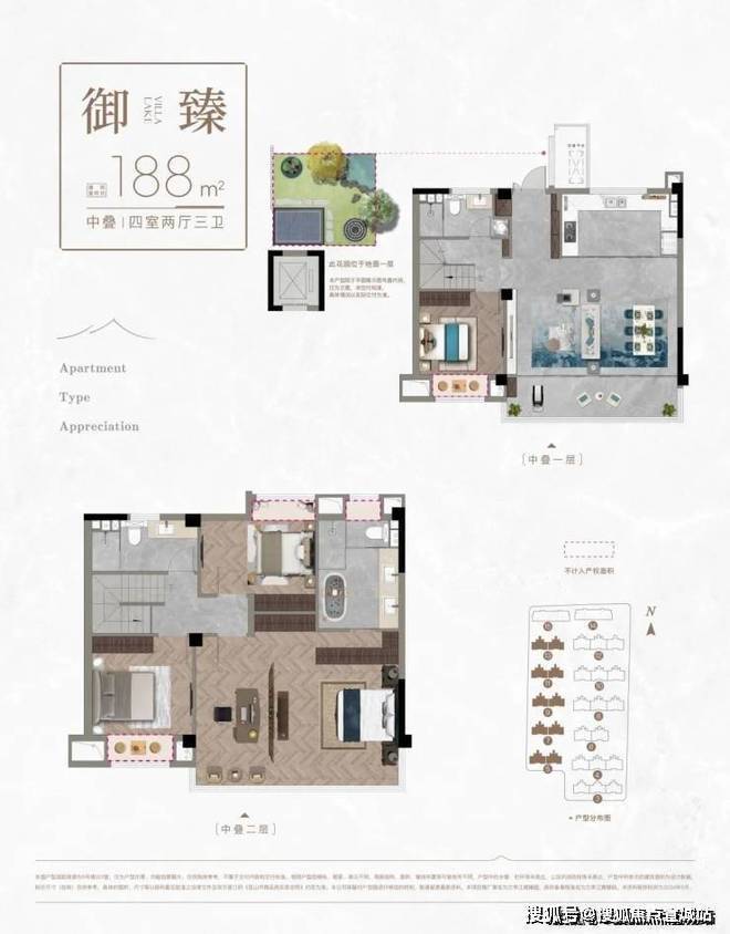 (3#5#7#9#11#13#小叠)中下叠建面:188平,四房两厅三卫(下叠送南向花园35平,中叠送北向花园15平)