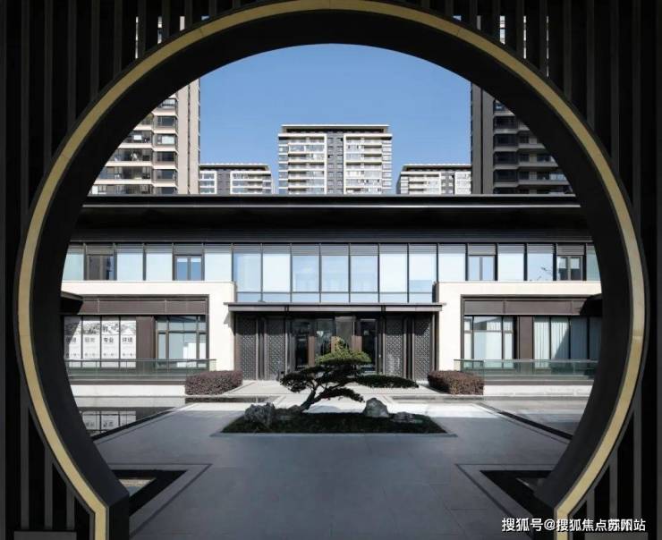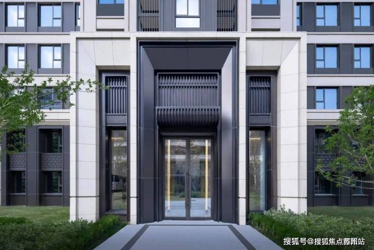 苏州相城#紫珺兰园营销中心热线:400-8123-664洋房门头以竖向构图为设计原则,加以颇具特色的中式格栅,为洋房简洁的整体的风格注入了别样的精致。