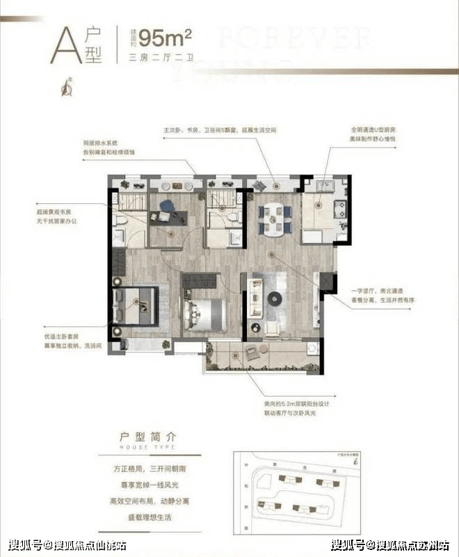 约95㎡3房2厅2卫户型,以边套为主,有非常好的采光和通透性。