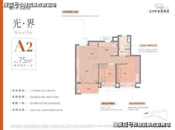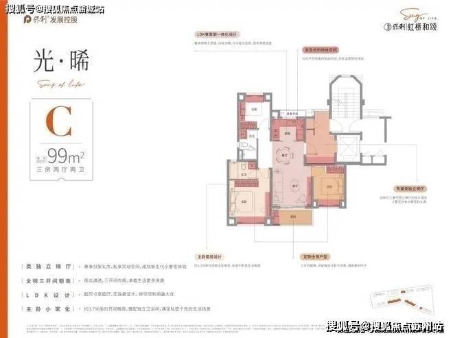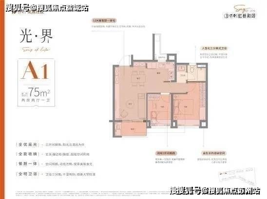 户型设计上,保利虹桥和颂,品质改善为出发点,设计“私属、至臻、尊崇”三大产品理念,臻奢建面约75㎡户型,三开间朝南,阳光与清风为伴,玄关+餐边柜+飘窗,全能收纳,卫浴三分离,干湿有别,奢阔餐客厅一体,空间明朗,动线流畅。