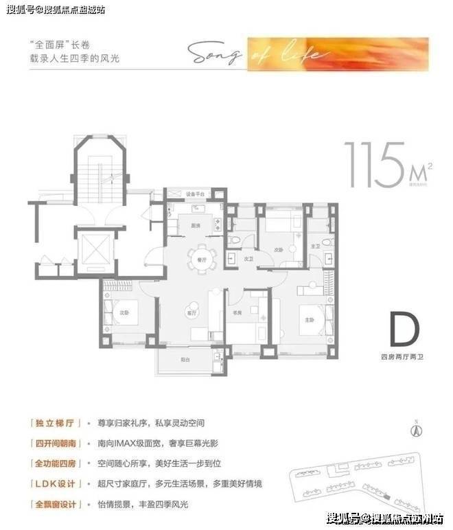 建面约115㎡4房2卫户型做到了同面积段罕见的四开间朝南+四房设计,南向IMAX级景观面,卧室阳光满溢,功能性也拉满。功能性十足的同时也不失舒适性,主卧南向大面宽+贯穿南北。