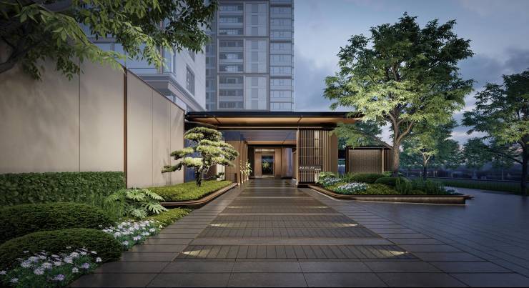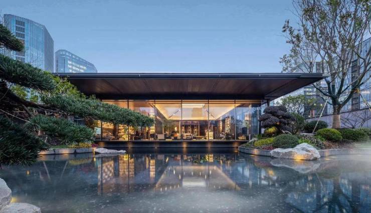 建筑风格:现代东方风格外立面,搭配江南园林景观示范区