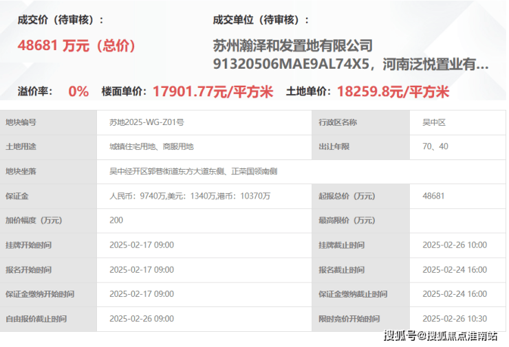 独墅湖西商住用地,由瀚泽和发、河南泛悦底价拿下,成交总价4.87亿元,成交楼面价17901元/㎡。