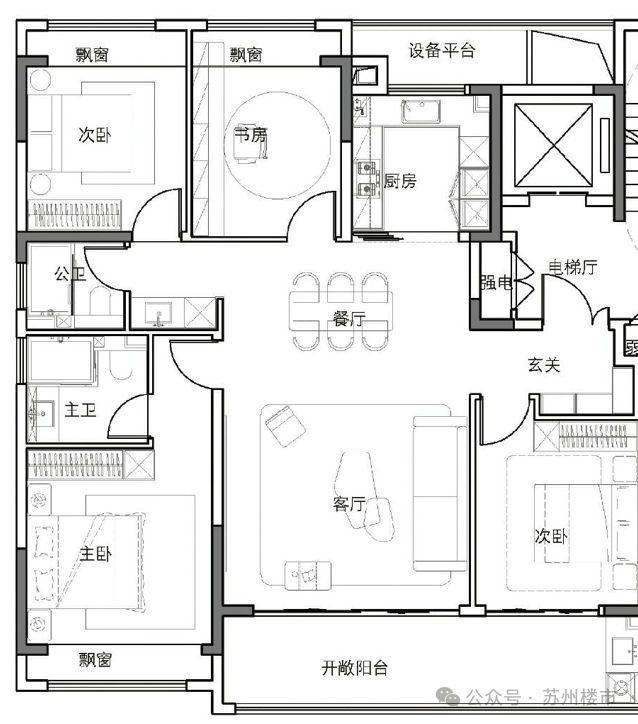 南向主卧套房+南向次卧+北向次卧+北向书房,适配三代同堂或者二孩家庭。入户玄关,全卧室飘窗,收纳自如。