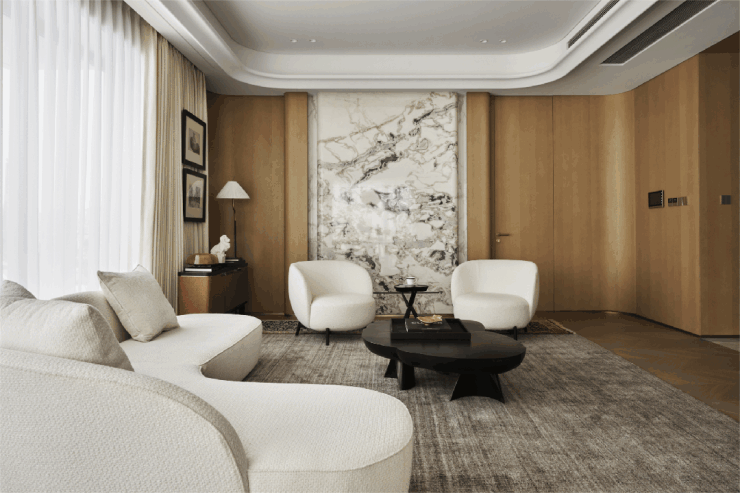 建面约388㎡的户型,称它为“顶豪之巅”也不为过,三梯两户的架构,配合双入户动线,在私密与通达之间建立了精妙的平衡,细微处见真章。