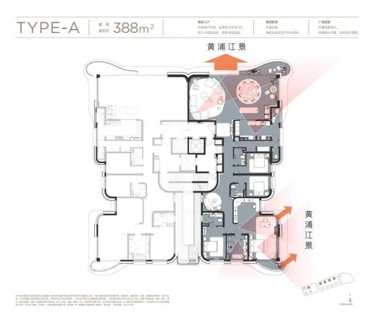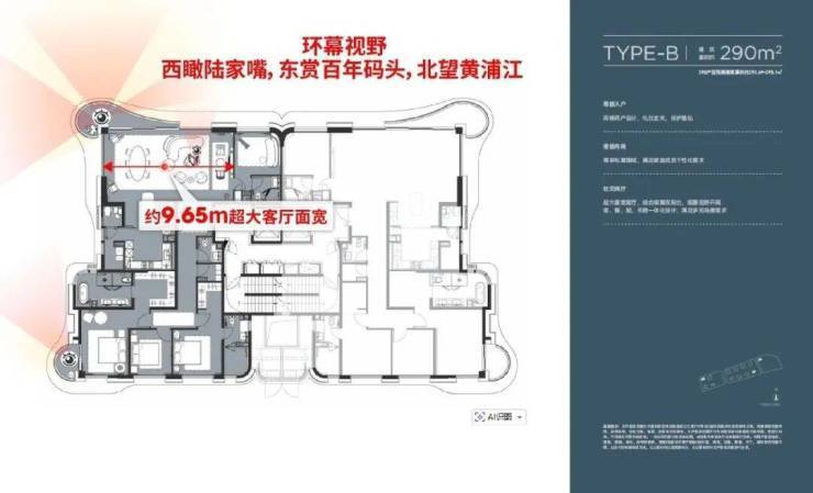 建面约290㎡户型,拥有约9.65米超大客厅面宽,搭配蝶翼双阳台,西瞰陆家嘴摩天天际,东赏百年码头人文底蕴,北望黄浦江浩渺江景,环幕视野拉满。