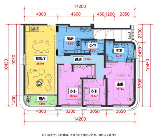 在功能空间的尺度上,整个客餐厅面积达到了约36.5㎡,主卧套房则拥有约28㎡大空间,足以媲美市面上建面约240㎡的产品。(该处面积为测算的净使用面积)