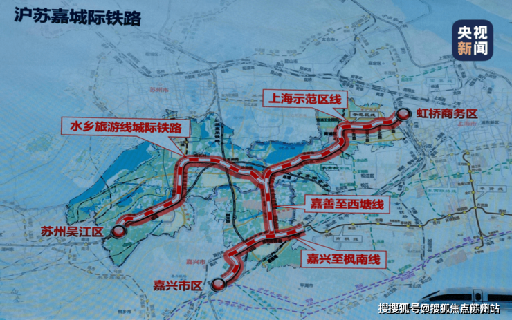 沪苏嘉城际铁路由上海示范区线(上海段)、水乡旅游线(江苏段)、嘉善至西塘线和嘉兴至枫南线(浙江段)共同构成。三线将会在水乡客厅站交会。全长170公里,东起虹桥商务区,南至嘉兴南站、向西至吴江区苏州南站,总投资940亿元。预计2028年建成投用。规划建设30座车站,其中上海段8座,江苏段9座,浙江段13座。其中规划建设路线最长的为江苏段,全长65.6公里,总投资约240.8亿元。