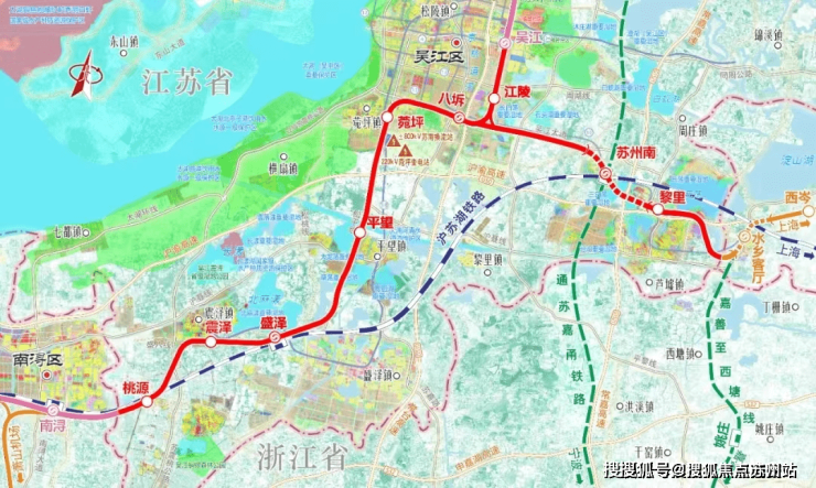 据悉,沪苏嘉城际铁路水乡旅游线(江苏段)均落在吴江辖区内,全长65.6公里,为沪苏嘉城际中最长的一段,总投资约240.8亿元,预计建设周期4年。起自水乡客厅站,经苏州南站与如通苏湖城际铁路共线经盛泽、震泽等地至南浔站。线路预计设置黎里、苏州南、江陵、八坼、菀坪、平望、盛泽、震泽、桃源9座车站。