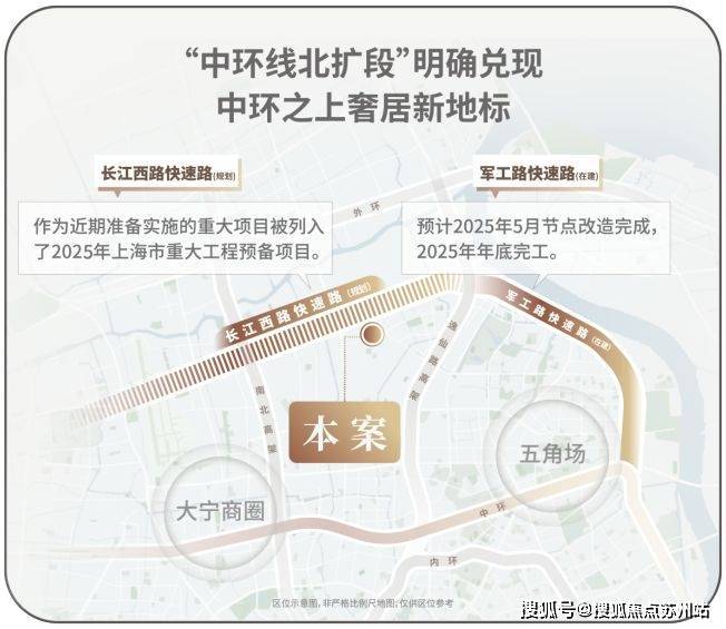 招商序售楼处营销中心:400-8828-814招商序售楼处电话/地址☎:400-882-8814(开发商热线)作为上海市重大工程,「中环北抬」通过军工路、长江西路、沪太路三条快速路互联,重构浦西北交通骨架。这项工程不仅延伸中环线,更通过立体路网打造串联宝山、杨浦、静安的「城市交通脊梁」,竣工后将形成复合功能交通带,推动沿线板块价值升级。