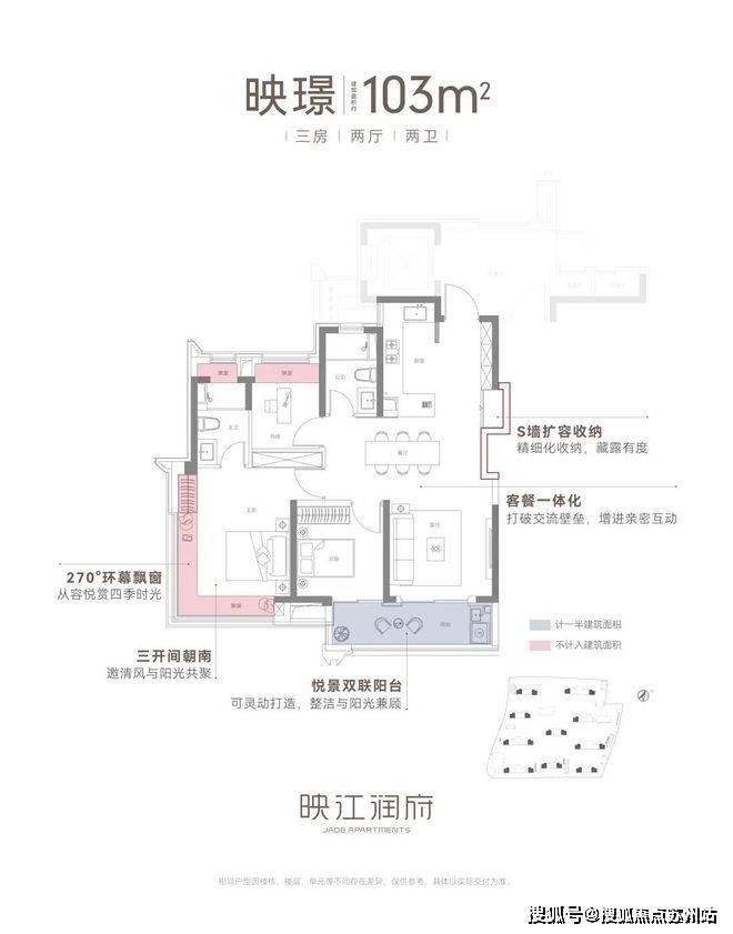 建筑面积约103㎡三房两厅两卫,不失为改善家庭的首选。其中边套户型,映江润府的主卧套房做了 270°环幕飘窗,实现无与伦比的采光通风和视野享受,类比于千万级豪宅的体验!
