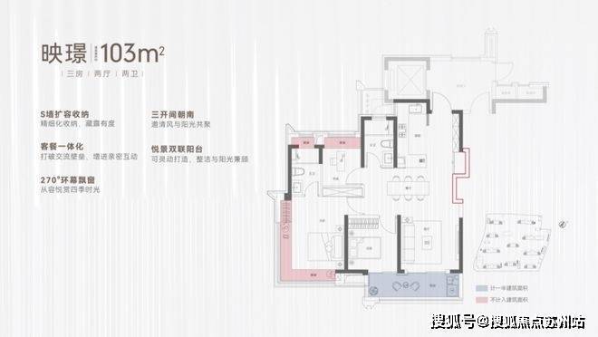 客餐厅一体化,连接南向大阳台。S墙的灵动设计,更加实现高效、精细化的空间利用,同类产品中并不多见。