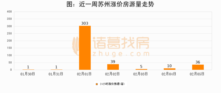 根据诸葛找房数据显示,苏州24小时涨价房源量为36套,较02月04日增加26套,环比上涨260%。与此同时,涨价房源占比小幅扩大,业主信心有所提升。