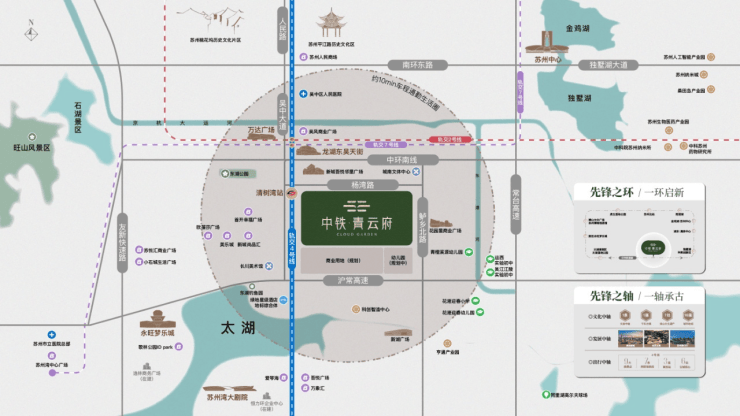 快速路网 :中环线串联全域枢纽,约15min速达姑苏主城、狮山核心区、金鸡湖CBD,以立体路网焕新通勤效率,勾画“半小时全城生活场”。