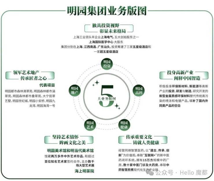 明园地产、明园投资、明园艺术、明园健康、明园高科五大业务版图