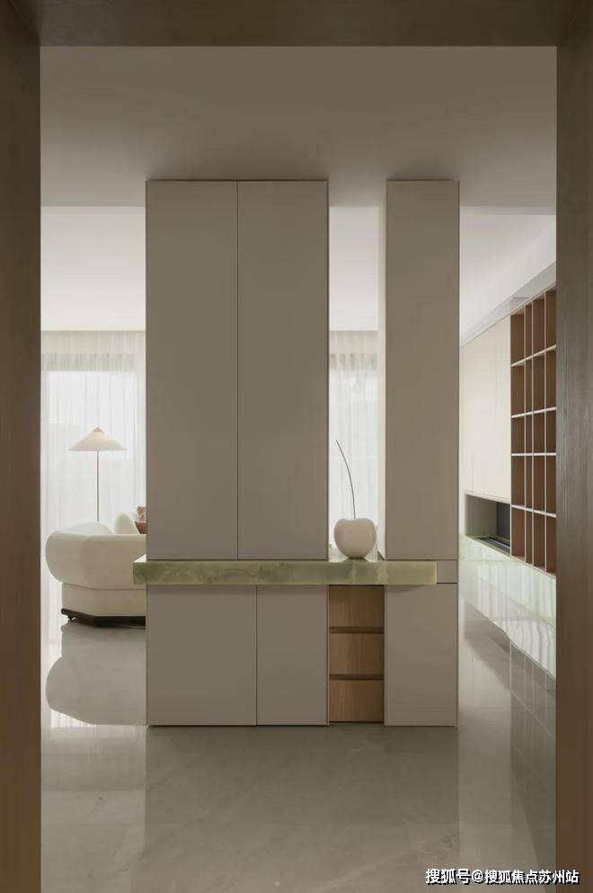 西厨岛台的设计具有强的视觉重心,运用温润的青玉做整个体块的包裹,结合了立柱与镂空的设计,使得整个空间看起来更加透气和谐。