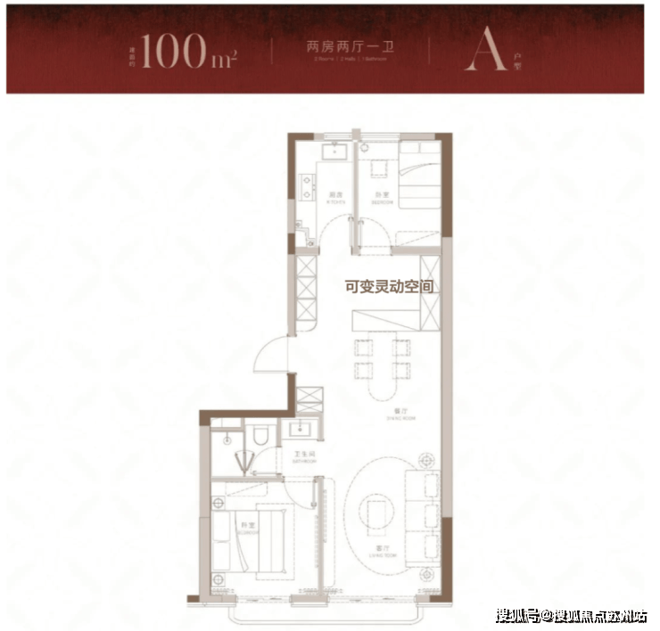 因为100平的2房布局,使得客餐厅一体的布局其实非常开阔,比起100㎡的3房来说,功能缺失一个房间,但现有的实际尺度感要舒适很多。