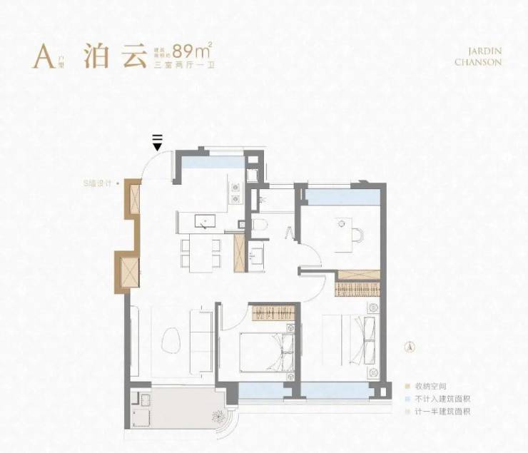 项目建面约128㎡4房户型延续了前作3S墙的设计,保证了收纳空间的丰富性。