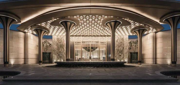 项目恢弘大气的门头,项目设计师以浮岛为灵感,将几根立柱化作悬浮的雕塑,撑起一片轻盈的仪式感。