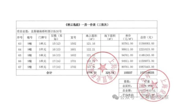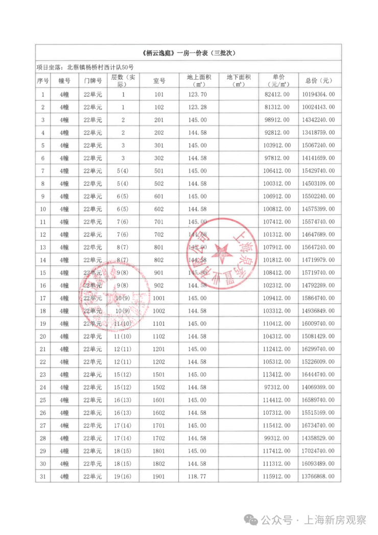 上期一房一价表如下: