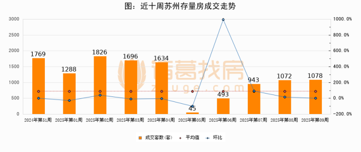 存量房方面,第09周苏州存量房成交1078套,较上周增加6套,环比上涨0.6%。从近十周成交走势来看,周均成交套数为1184套,本周低于平均水平9%。