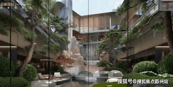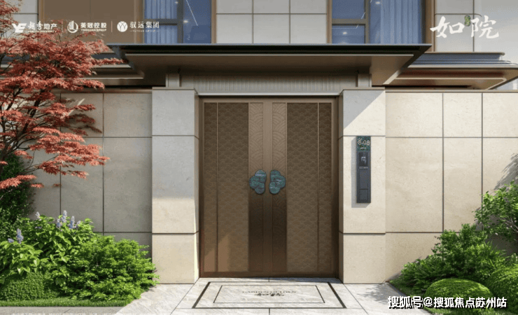 项目以东方宋韵与现代艺术相融合为设计理念,入户门厅采用引园入院的手法,门前水流透过景墙、两侧相迎的黑松以及铜元素入户大门的设计,让归家之路更具尊贵仪式感。