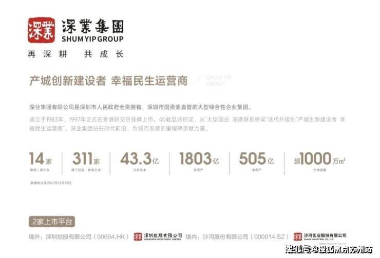 深业集团是深圳市人民政府全资拥有,深圳市国资委直管的大型综合性企业集团,成立于1983年,1997年正式在香港联交所挂牌上市。